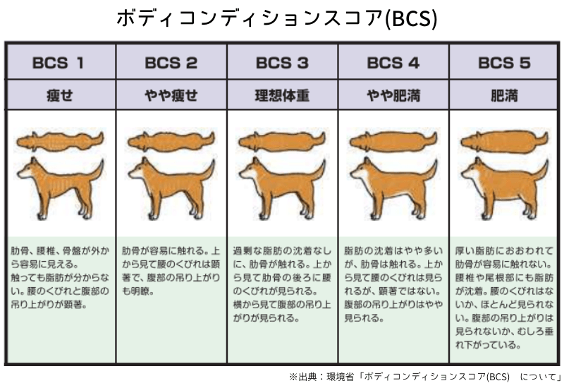 まずは、愛犬の体を触って、適切な体型かを確認しましょう。その目安として参考になるのが、「ボディコンディションスコア(BCS)」です。