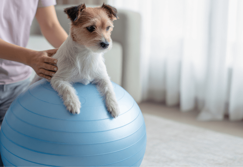 シニア犬用のバランスボールを使った運動は、上に乗るだけで後ろ足と体幹を鍛えることができます。
