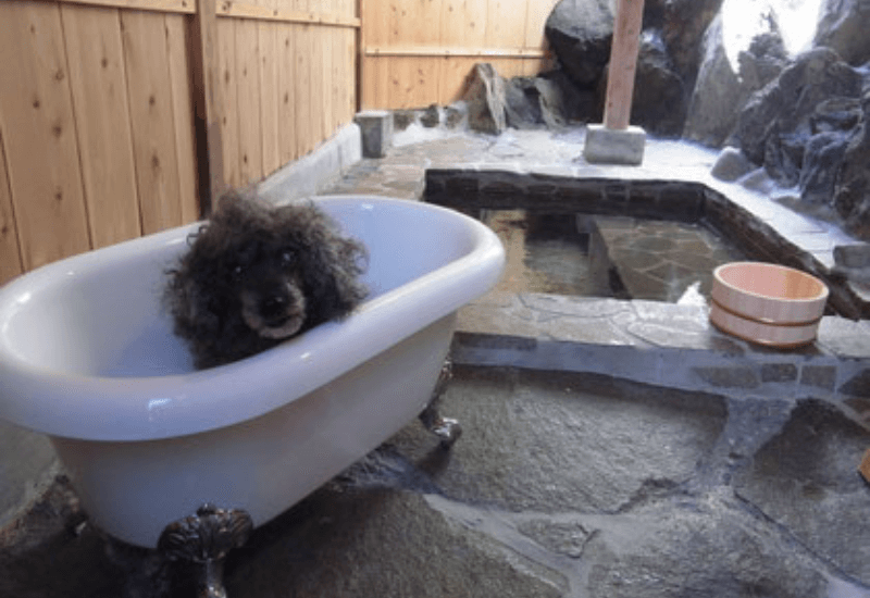 全室貸切の半露天温泉付きで、犬専用の湯舟も用意されており、家族と愛犬がともにくつろげるところが魅力です。