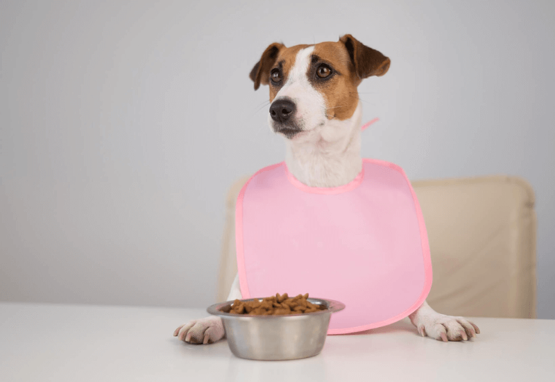 食事中に胸まわりや前脚が汚れないように、スヌードを使ったり、器を高くしたりしてみましょう。